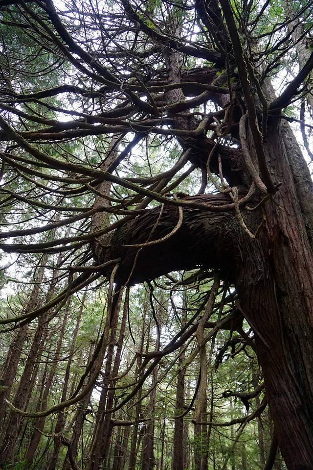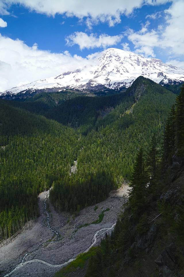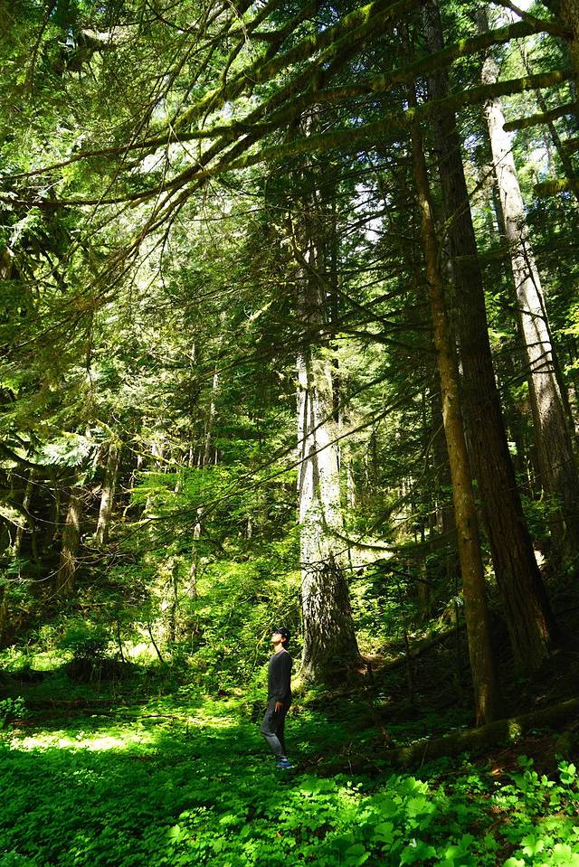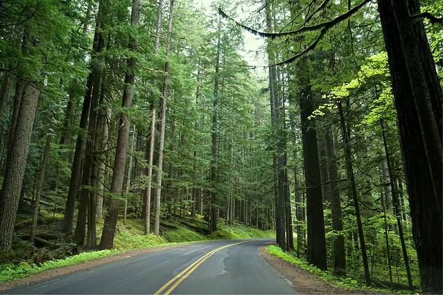 Mount Rainier(瑞尼尔山) 是一座处于休眠期的活火山,国家公园的景点围绕在火山脚下,有三个入口、三条旅行线路,和大多数国家公园一样,园内的旅行线路相互之间并不相通。两旁茂密的森林迅速点燃了我们的兴奋模式,之前的昏昏欲睡一扫而光。车子开在森林中,两旁的树像一堵绿色的墙快速向身后移动着,看到这么美的风景,开了两三个小时车也该休息一下了,我们找了一个空地把车停下来。一下车,我们俩就各自奔喜爱的景致跑去——乐哥去拍山间的小溪流过长满青苔的石头,我则深深被“张牙舞爪”的大树枝桠所吸引,看着那些树舞蹈般的伸展着树枝,我完全相信它们就是一群树精灵,会移动、会说话,就像童话故事中描述的那样。在这片树林中,感觉好特别,好像周围的一切都是“活”的,是有灵魂、有情感、会交流的,我能感受到TA们把喜悦、欢乐不露声色的植入了我的心里,我是那么的舒服,那么的开心,那么的自在,仿佛我也是一棵姿态优美、翩然起舞的大树,我们正享受着春日的阳光,开着一个欢乐的party。