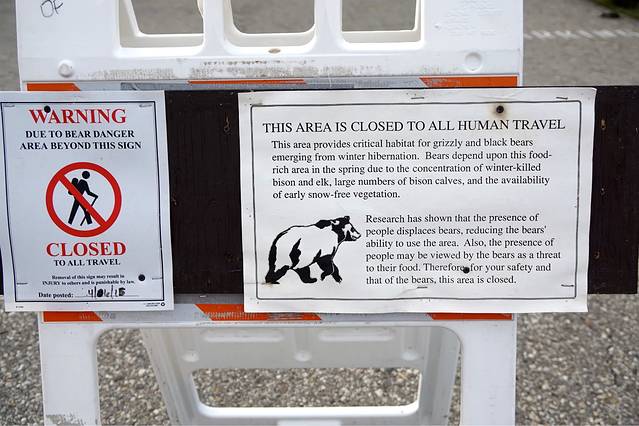 从进入大提顿开始,就不断的看到各种关于熊的警示牌,到了黄石也是如此。起初,到了空旷无人的地方看到那些画着熊的警示牌,还有些担心,害怕真的跟熊装个正着。后来想想,那么多人带着望远镜四处搜寻,都不一定能看到熊,我们怎么可能那么容易就遇到啊。人家都说,在国家公园看到熊是要非常好的运气呢,所以,也就不那么紧张了。
