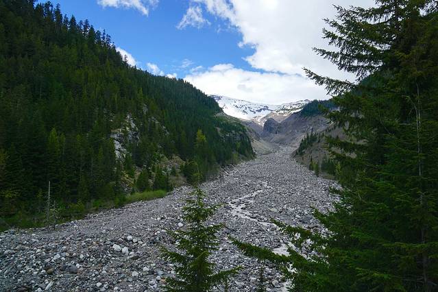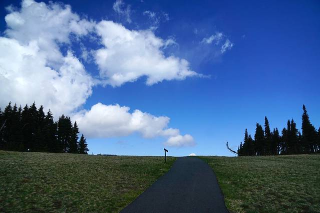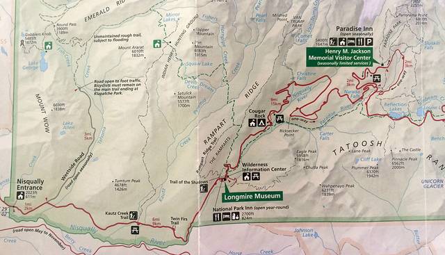 Mount Rainier National Park的核心景区在Paradise,地图上有几处标识不是看得太懂,园区里面的路很多写了“季节性开放”,不知道西南门到东北门之间的路是不是连通着,所以保险起见选择了Nisqually Entrance(西南门)入口进园。后来发现这个选择实在是英明,因为到了Paradise前面一个湖的地方,道路就封闭了——就是地图上写着"Stevens Canyon Road open seasonally”的这条路还没有开放。