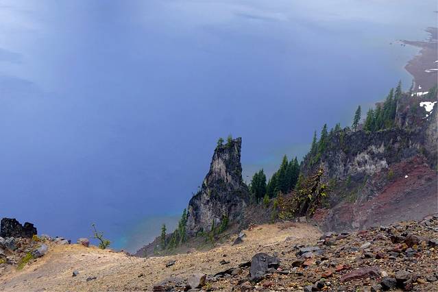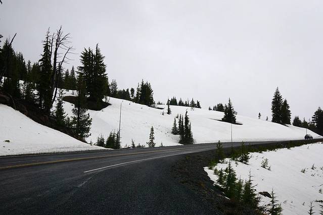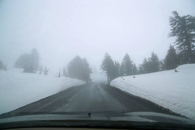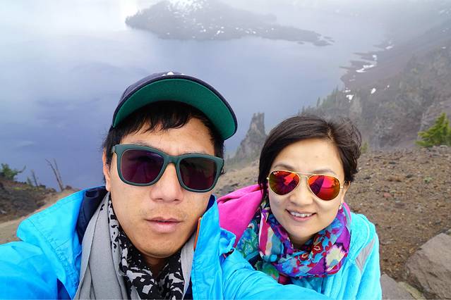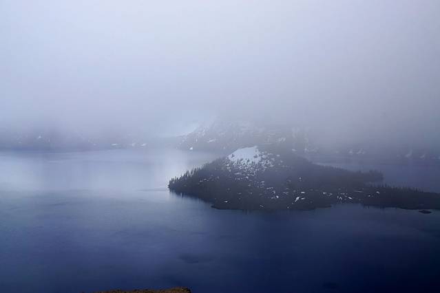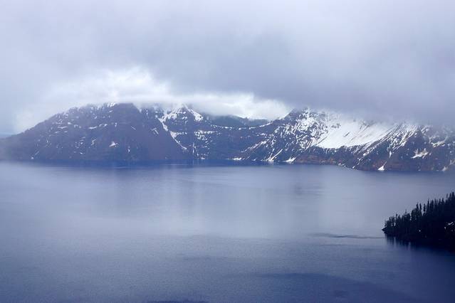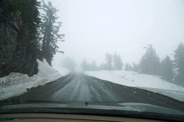 话说美国的天气预报真的非常准,可以预测十天的天气,几乎没有出入,所以,天气预报说火山湖这里是雨天,就算我们从阳光明媚的Sutherlin(萨瑟林)出发,150公里外的Crater Lake National Park(火山湖公园)也一定是会雨天的。昨天赶了一天路,今天却遇到了下雨天,而明天这里就放晴了,多么坑爹的安排啊!有时候就是这样,一点疏忽打就会打乱阵脚,如果我昨天先看好天气预报,就不至于遇到阴雨天了,我可以从从容容的在波特兰玩上一天,今天悠悠闲闲的来到火山湖附近,明天踏踏实实的游玩火山湖。可是,没有可是,没有如果,我们只能冒雨游湖了。
