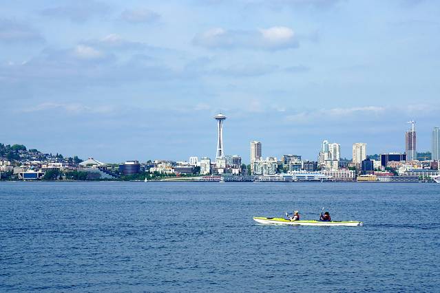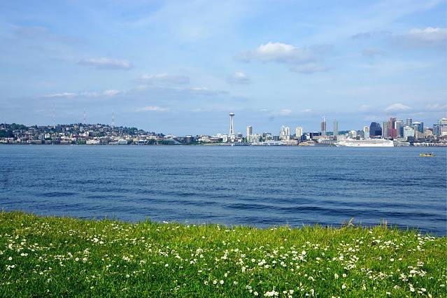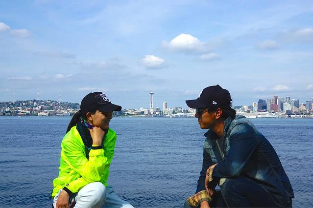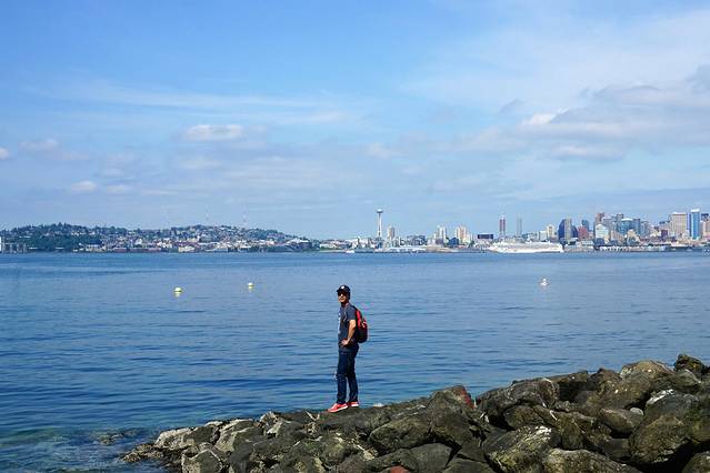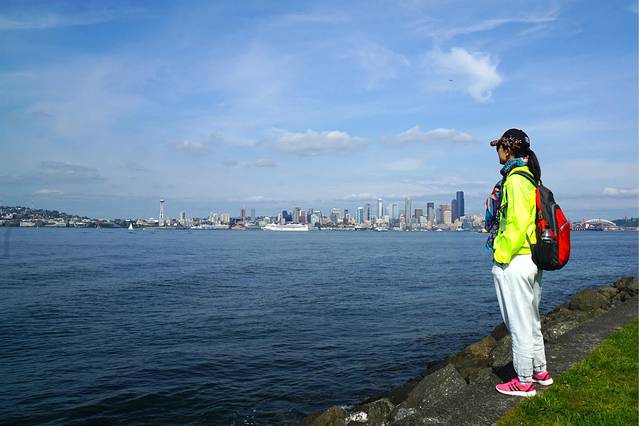 在Alki Beach Park(阿尔基海滩公园),沿着海边的步道,可以欣赏对岸西雅图林立的高楼,当然,太空针总是会特别醒目的出现在画面中。这条步道蛮漂亮的,有人跑步、有人遛狗、有人拍婚纱照……我们走走停停发发呆,感觉蛮不错的,来到大城市也可以不去体验繁华,而是尽享悠闲。