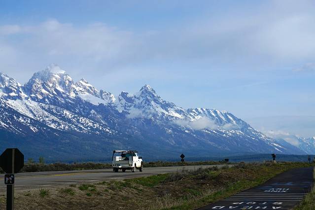 大提顿国家公园有12座在冰川作用下形成的山峰,清晨的阳光温柔的洒在雪山上,轻轻地唤醒群山、大地。喜欢睡懒觉的我这天鬼使神差的很早就醒来了,早上8点已经来到了大提顿公园,难道我是受到了雪山的召唤?游人尚未到来,偶然会有一两台车驶过,路边的小鹿都惊讶于我们如此的早。