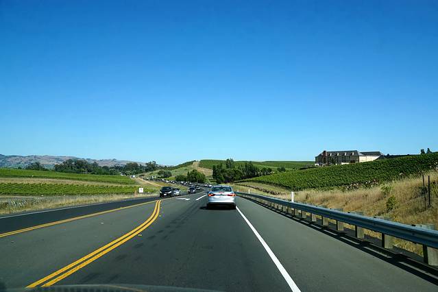 一进入Napa区域,就看到了长长的车流,已经不是美国的公众假期了,还是有这么多的人来纳帕,看来它是很有魅力的呀!纳帕是美国著名的葡萄酒产地,遍布了很多的酒庄,而且酒庄极尽所能的建出特色以吸引游客。