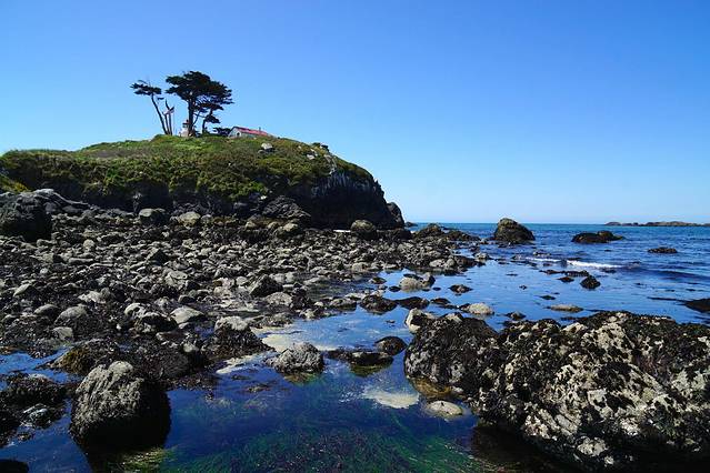 昨天在海边看到海中有个小岛,看起来是和陆地分开的,但是上面有建筑,猜测着是不是私人小岛?是不是要撑船才能上岛?晚上回酒店研究了一下Crescent City(克雷森特城)的旅游资料,发现那里原来是一座灯塔,旁边还有一个博物馆,小岛是可以免费去参观的。今天一早,我们的第一个目的地就是这个有灯塔的小岛,一是比较喜欢灯塔想去看看,二是很好奇明明是在海中间的,要怎样登岛?来到跟前我们才发现,通往小岛的几百米的区域是一个巨大的潮汐池,海水退去就可以踩着石头登上小岛,海水涨潮的时候大概需要涉水才可以登岛。