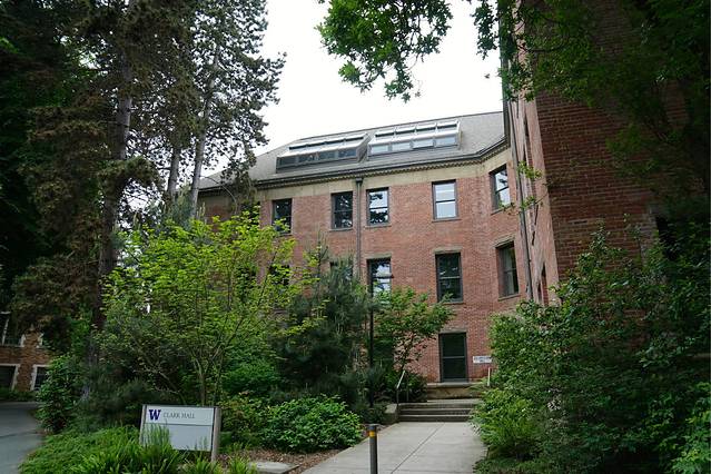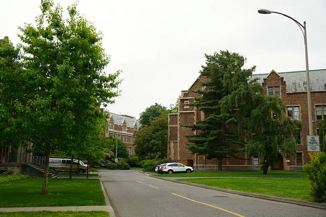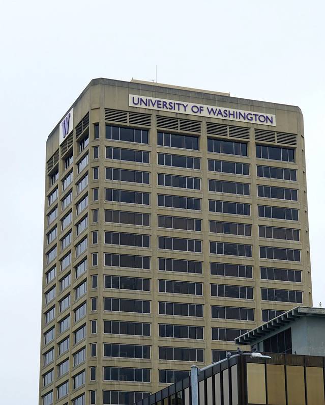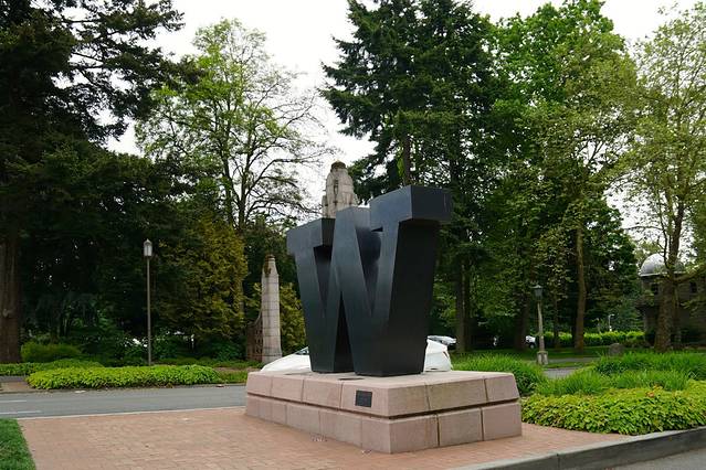 今天我们不打算走太远的路,就想在西雅图闲逛一下。在网上搜索到西雅图的大小景点很多,但大都不是我们的兴趣所在,也许海边的步道是个不过的选择,然而,微软附近的小肥羊火锅似乎比任何景点都更加吸引我们。睡到自然醒起来,我们就往小肥羊方向开,沿途经过了华盛顿大学,就顺便进去溜达了一圈,不知道是不是我们走了侧门,没有看到学校大门,只在一个入口看到“W”的雕塑。因为停车费太贵($15/车),我们只是在校园里开着车走马观花转了一圈。校园很安静,建筑古老而庄重,偶尔有学生骑车经过,极少遇到人。