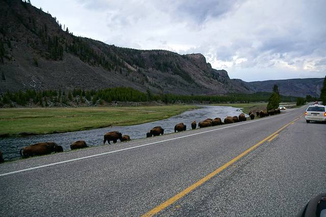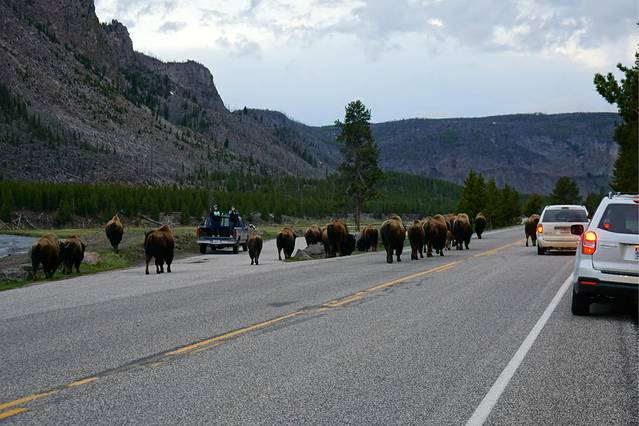 离开公园的时候太阳已经落山,一群野牛沿着河边的公路浩浩荡荡的走着,也许它们也要回家了吧。这一天,我们从早上8点游到了晚上9点,好充实啊!
