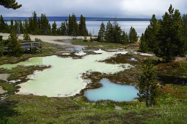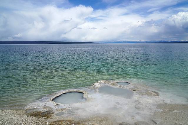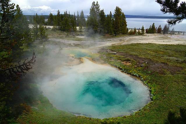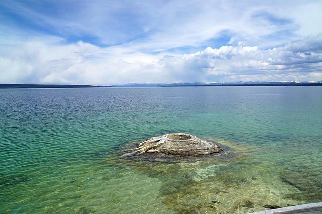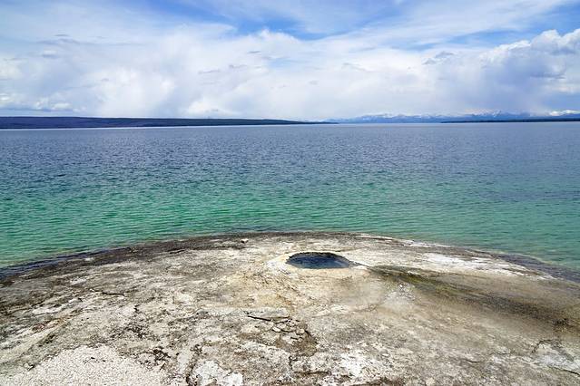 West Thumb(西拇指盆地)在黄石湖的西边,分布着很多的热泉,湖边的热泉颜色非常漂亮,最大的特色就是湖中的热泉。因为这里是我们进入黄石游览的第一个热泉区域,看到的一切都感觉非常奇妙,热泉升起的白烟,配合着色彩鲜亮的泉水好梦幻。