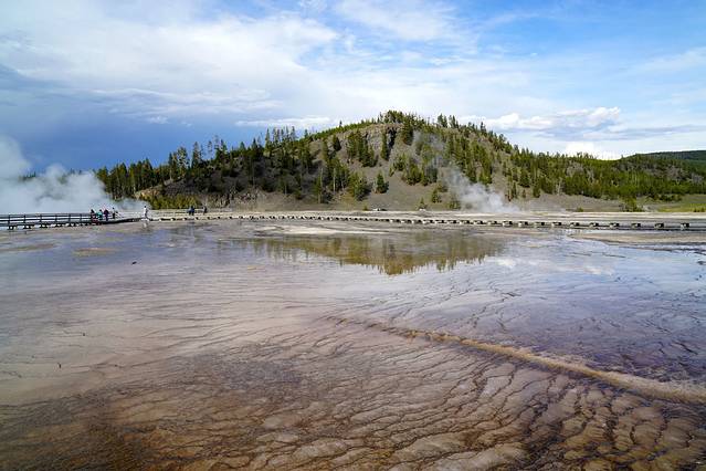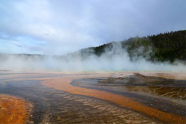 的确,今天看到的大棱镜比昨天清晰很多,中间的蓝色都能看到了,形状也完全显现出来了,只是我们是平视,角度低拍不出全貌,但我们已经相当满足了。还有一处蓝色的热泉,昨天经过的时候只看到浓浓的白色烟雾,根本看不清有多大、什么颜色,今天竟然也显露出啦了,不枉我们再探Midway Geyser Basin啊!