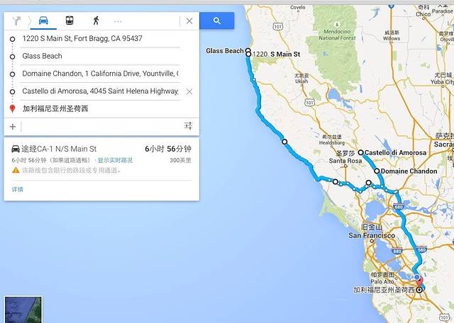 Fort Bragg 布拉格堡酒店出发 →Glass Beach(玻璃沙滩)→ Domaine Chandon 纳帕酒庄→ Castellodi Amorosa纳帕酒庄 →返回San Jose 圣何塞行程结束(500公里)