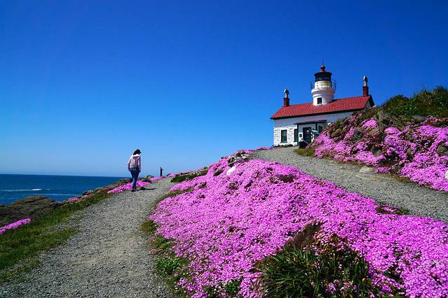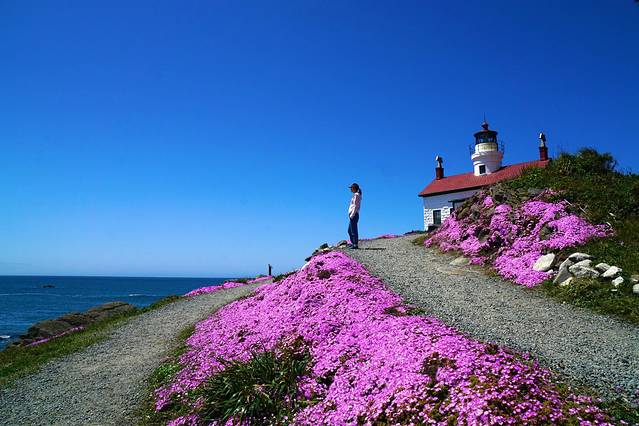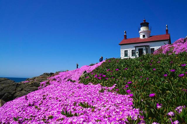 这个小岛蛮漂亮的,肉肉植物长得特别好,粉紫色的小野花开满了山坡。灯塔的下面是一个小小的博物馆和纪念品商店,在美国看过几个灯塔都是这样的结构,下面是博物馆,顶端是灯塔。