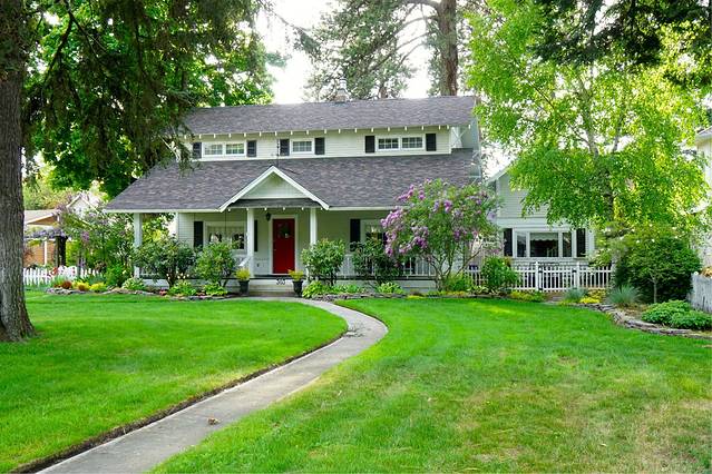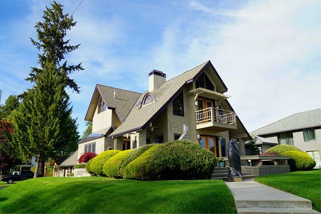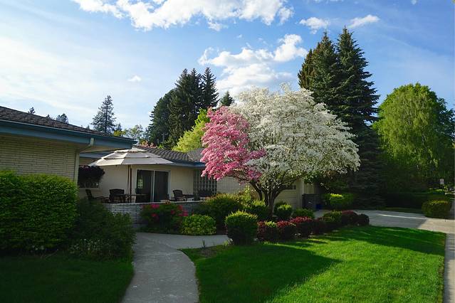 与Coeur d'Alene (科达伦)的相遇也是纯属偶然,我们在路上看到一个很漂亮的湖,就说离开公路去看看。沿着地图上湖的方向一路开车过去,发现这个城市好漂亮,来到湖边发现这里的建筑好美,每一间房子都很有特色,每一家人都很用心的用各种植物装扮着房前屋后,这一定是一个很有幸福感的城市。上网查了一下,发现科达伦是属于爱达荷州的,记得从盐湖城去黄石的路上就经过了爱达荷的一个大城市Idaho Falls(爱达荷福尔斯 ),城市中桥下的瀑布水景令我印象深刻。现在来到的Coeur d'Alene (科达伦)境内有多个湖泊,是一处受欢迎的旅游胜地。既然天色渐暗,我们不如就此停留吧,上网找了一家附近的酒店安顿下来,明天的路明天再走吧。