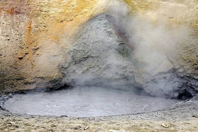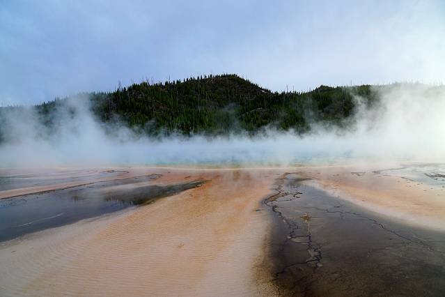 Grand Prismatic Spring(大棱镜)所在的区域有三个间歇泉盆地,分别是Upper Geyser Basin(上间歇泉盆地)Midway Geyser Basin(中间歇泉盆地)LowerGeyser Basin(下间歇泉盆地),这么大面积的热泉、间歇泉、喷泉以及蒸汽泉、泥盆,我们简直是目不暇接!各种颜色的池子热气腾腾的呈现在我们的眼前,广袤的土地上四处白烟飘渺,真感觉幻梦般的失真。