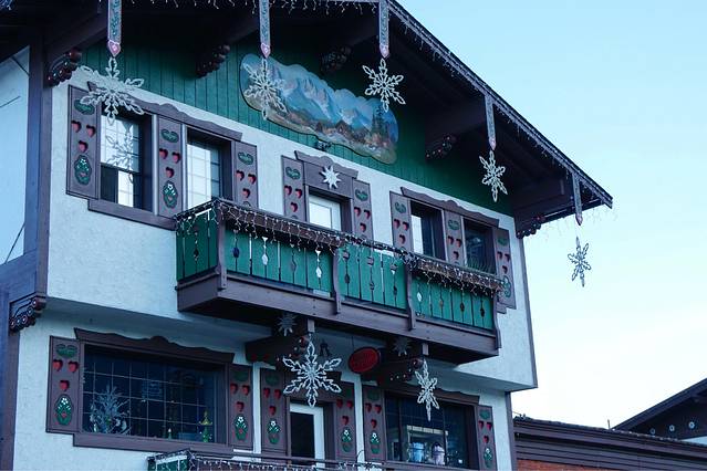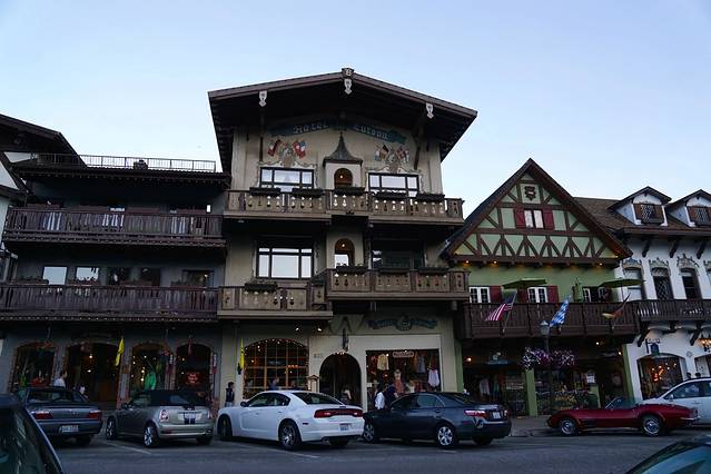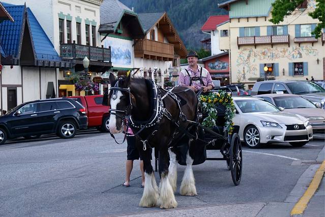 这一路的沿途风光依旧很美,现代化的美国农业设施随处可见,天也格外的晴朗,一切都很美好。傍晚时分来到了莱文沃思,期待的惊喜并没有如约而至,我略带调侃的对乐哥说“不能错过的是什么?”他东张西望的找着什么,然后把车开进了一个停车场,当我们走下车,面前的街道把我惊呆了!实在太梦幻了!简直就是童话世界啊!那些房子,好像圣诞节的装扮,房子上那些可爱的图画,漂亮的橱窗,复古的马车,还有满街食物的飘香,一切来的太突然,我简直无法相信自己竟然置身于这么美妙的一个所在,刚才还是平淡无奇的街道,只是一个转身,就仿佛掉进了童话的仙洞里。