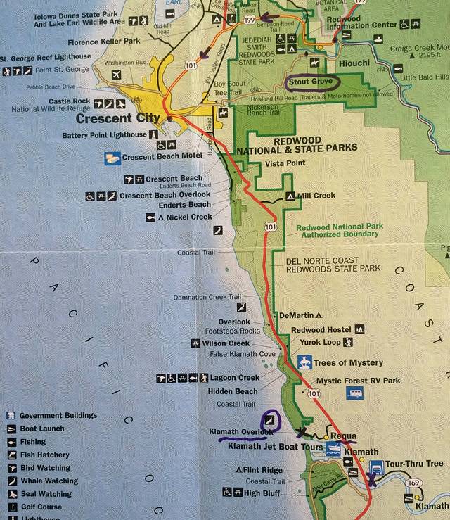 今天注定是休闲的一天,昨天我们都没怎么研究周边的景点,对于这么一大片红杉树公园要怎么游玩,完全是心中无数。我们去了位于克雷森特城市区内的游客中心,要了免费的地图,并咨询了周边的景点。这一带有很多玩法,可以游红杉公园,可以游海滩,工作人员会根据游客的取向指引游玩的路线。我们今天就完全按照她的指引,去了JedediahSmith Redwoods StatePark(杰迪戴亚.史密斯红杉树州立公园)和Klamath Overlook(克拉马斯观景台),如果她没有推荐我们去JedediahSmith Redwoods StatePark的Stout Grove,没有告诉我们有一条环线景色非常美,也许我们不会去这个州立公园。因为一般情况下,有国家公园在,我们都会忽略旁边的州立公园。但几天游览下来,我们才搞明白,这一片区域包含了Smith Redwoods StatePark、Del Norte Coast Redwoods State Park和Prairie Creek Redwoods State Park等三个州立公园以及一个Redwood National Park国家公园,它们虽然都是红杉树森林但各具特点,共同被列入了世界遗产,所有公园都可以使用国家公园年卡,可以作为一个整体来规划游览。感谢游客中心的工作人员细心的讲解,让我们没有错过美好的风景。