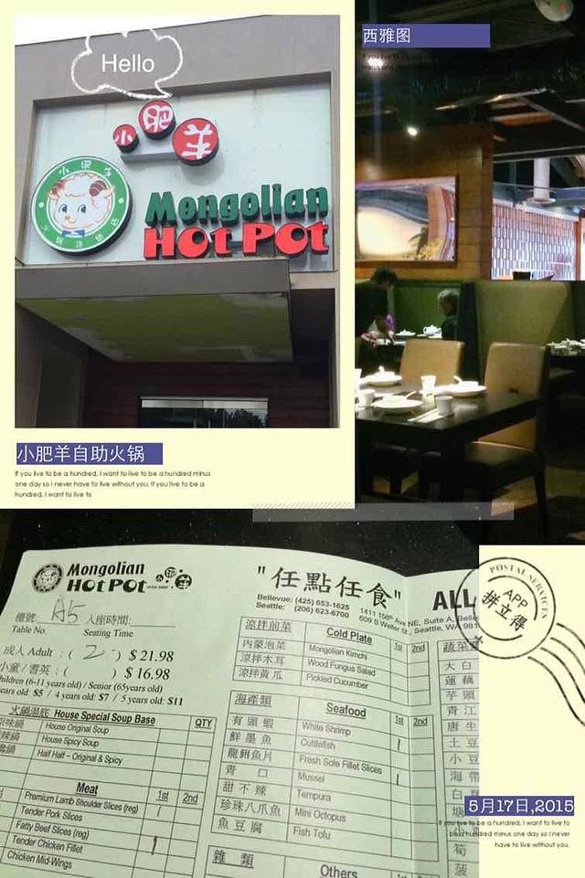 话说我们迫不及待的来到了小肥羊,距离营业时间还有10分钟,在附近的停车场等了一会儿,前几名进入了餐厅。小肥羊的环境蛮不错,服务更是一流——因为服务员是讲中文的,餐牌是中文的。至于味道,那是绝对的赞,比在国内的还要好吃,吃完一点都不会觉得口渴,说明没有那么多的味精。西雅图这家店的用料很新鲜、品质不错,比我们后来去的旧金山那家要好,这里的虾个头超大,味道鲜甜,是在中国要卖上百元一斤的那种。而在这家小肥羊,我们竟然是可以不限量的点很多份来吃,因为是自助餐,任点任食。我们两个人的餐费加上税和小费,一共吃了57美元,不仅在美国算是便宜的,就是在中国也不会觉得贵啊。
