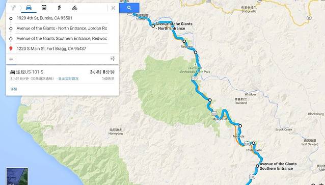 Eureka 尤里卡酒店出发 →Avenue of the Giants (巨人大道)→ Fort Bragg 布拉格堡酒店入住(230公里)