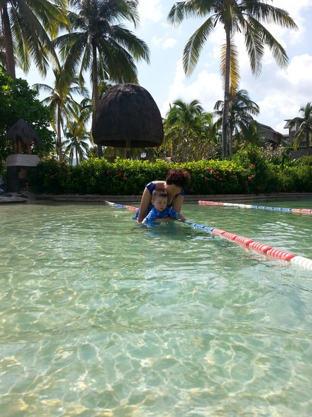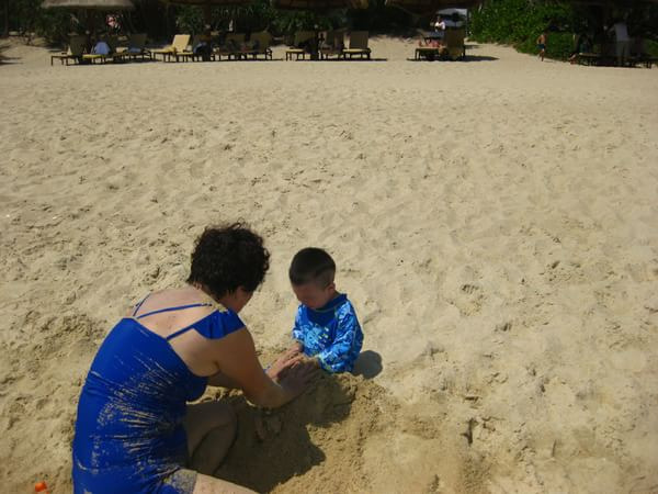 两天继续宅酒店,两天都是天风和日丽,母亲心情也好了,全家下海,住在海边的老丈人他们,满口称赞,亚龙湾的海水太好了,人在里边都能看见腿,不过,希尔顿的海边有一条不短的贝壳带,扎脚,不是太好,进到海水里边就好多了,儿子在人造沙滩玩到2点多 才去睡觉,真是享受人生啊。老爸喜欢游泳,室内游完,大海游,特别的开心。