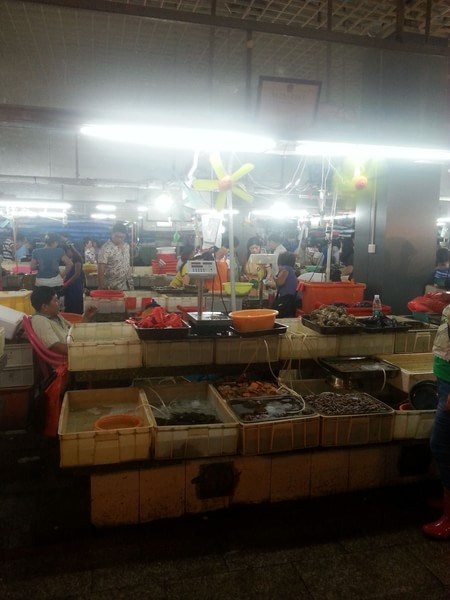 因为昨天玩的比较累,今天休息了下,准备带丈母娘和老丈人去市里溜达溜达,买些特产回去,中午去军友买了点小海鲜,实话实说,军友的价格稍微偏贵些,吃饭后,一行人,坐上了传说中的8路,去第一市场,先探了探地形,为晚上的海鲜大餐做准备。最后还去了趟夏日百货,回来在第一市场附近的旺豪采购了一堆东西,回到公寓已经4点多了,因为第二天就要离开公寓去酒店了,因此联系了前一天的师傅,跟他讲好,把我们从海岸名都拉去呀诺达,然后再拉去希尔顿,门票让他按淘宝价格买给我们,老年票自己买,整体下来,还是比较划算,一切搞定,一家人在三亚湾拍了几张夕阳(可惜那天云彩太多,没拍到落日,遗憾),就和两位父亲,外加媳妇杀奔第一市场买海鲜去了,其实第一市场的海鲜区不大,起码没有沈阳的海鲜市场大,我们选的加工店是惠而来,因为啥?加工费便宜,店里派了 一个大姐跟我一起去买海鲜,其实不用指望人家给你杀价,杀价也就是一个形式,不必太在意,自己觉得可以就好了,中午来的时候,几个自己想吃的 都问过,上下差不多就可以,毕竟人家也要盈利,自己出来图个开心就好,不过这大姐非常实惠的,告诉我们虾爬子(北方叫法,南方叫皮皮虾)不肥,别买了,最后采购了,龙虾1只,150,和乐蟹3个,大个的,每个65元,大海胆4个,30元,象拔蚌6个,42元,二斤虾,40元,带子一斤,20,外加加工,110元,和一瓶芒果汁,打包一份椰子饭,一共700多元,搞定,回家,就是他家人太多了,从买海鲜,到走,一共用了2个小时左右,太久了,到家都8点半了,等待过程中,还吃了个炒冰,真好吃啊,不过看见那放在污水中的笊篱,估计各位也没啥食欲了,不过我完全无视,哈哈。