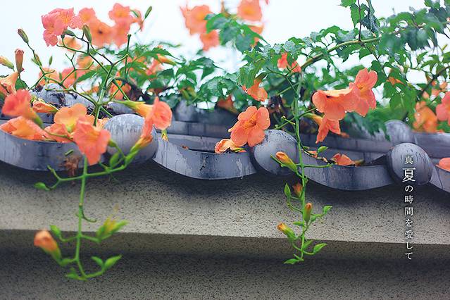 不知不觉已经走到了酒店外面的小街上,下雨的清晨,街上并没什么行人,但对于我们来说,却有了更多耐心好好观察身边不起眼的一切,比如越过围墙的鲜花(别说红杏出墙,多难听啊哈哈哈哈)和落满一地的花瓣。雨天花瓣都被打湿,叶子也显得更绿更透亮,想象下,如果这是个高温的夏天,恐怕你就没心思去观察这些小细节了吧。