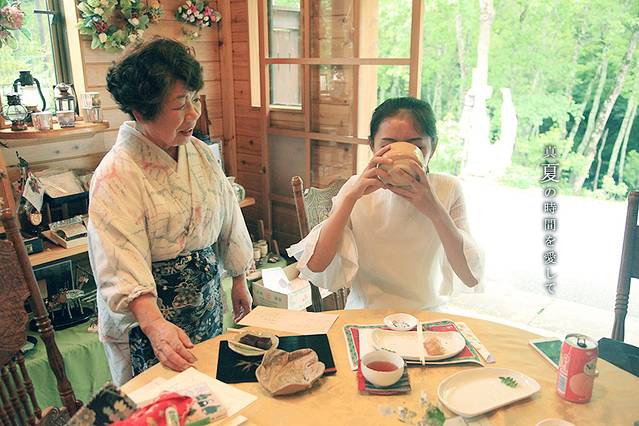 正吃着饭团呢,老奶奶又给我们泡来一杯茶请我们喝,还放了刚泡好的一壶在旁边,说如果觉得好喝就再倒来喝。