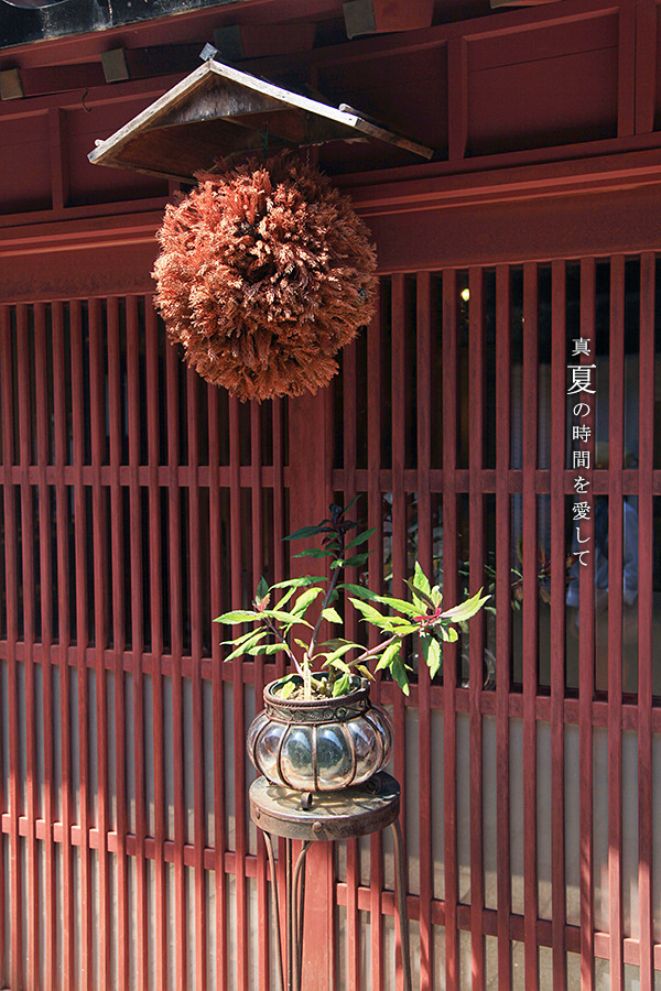 日本几乎所有的神社门口都会有这样一个洗手的地方,拿着水池边的长柄木勺舀起水来净手,然后再前往神社旁边的拜殿钱投入一些硬币,拍几下手,然后祈祷。有一些拜殿前面还会挂着特别粗特别长的麻绳,人们可以抓住摇动,撞得上面的风铃发出响声,在京都的八坂神社就能看见这样的景观。
