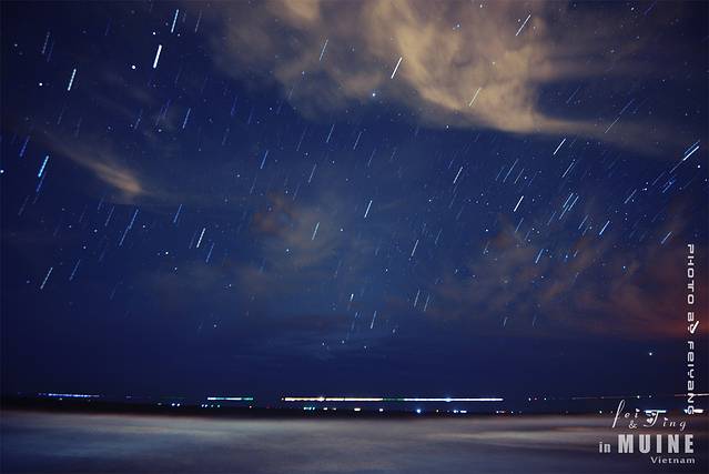 洗去风尘仆仆换身衣裳,沿着鹅卵石铺就的小路来到沙滩。风吹起裙裾吹起长发,看不到尽头的海岸线空无一人。星空低垂,因着夜色浓重,能看出星星的颜色各异,蓝丝绒般的大海涛声如雷却备显静谧。晚风清咸,漫天星辰静默,只映得树影婆娑,城市浮华宛若南柯一梦,难辨今夕是何夕。Fei在专注地拍星轨,我走近他,像在寂寥的海底走近一丛孤独的珊瑚,站在沙堆高处看镜头里的影像群星浩繁,海波温柔。夜色挽起他的衣袂,临风翩翩。那一刻心生满满的感激,不是对他,是对命运。是的,我晓得天地辽阔万象变幻,亦和你一样走过很多地方看过姹紫嫣红,竟不知是那一颗星星指引着我们在时间的旷野里相逢,没有早一步也没有晚一步。我感激它。