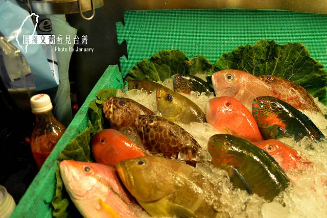 攤位上擺著的色彩繽紛的魚。