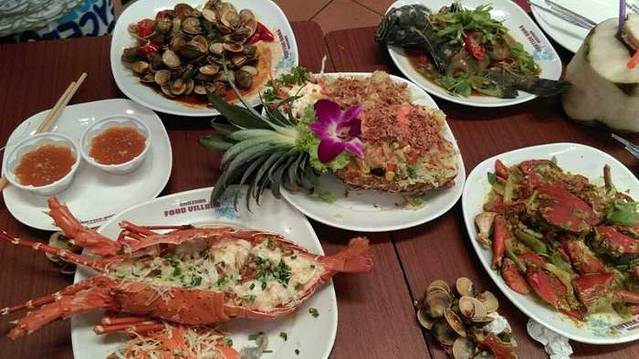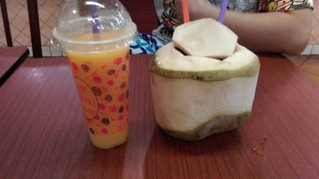 所以功力不深厚的话被宰点是一定的。上了二楼直接去大家推荐的“你的厨房”人家一口价就要700珠的加工费没商量,我转身就走了,真是被国人捧过头啊。去旁边随便找了一家要400珠,就这样吧,柜台都有各种口味做法的图片,看图说话就行。又要了一个菠萝炒饭,芒果沙冰和椰子,这顿两人的海鲜大餐花了不到500+rmb,也算不上便宜了,所以不推荐班赞市场被捧的漫天要价,还得另付加工费。直接去海鲜大排档或者小店,价格都差不多也可以还价起码省个加工费。这餐味道做的中规中矩我俩都能接受,还是满意的。