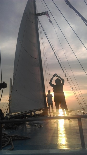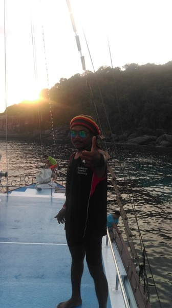 饭后的时间就很安逸啦,没有人再想下水了。大家都上了甲板等待看日落。这时就统一开启了拍照模式,各种自拍或者和船员合影。超友好的大副。
