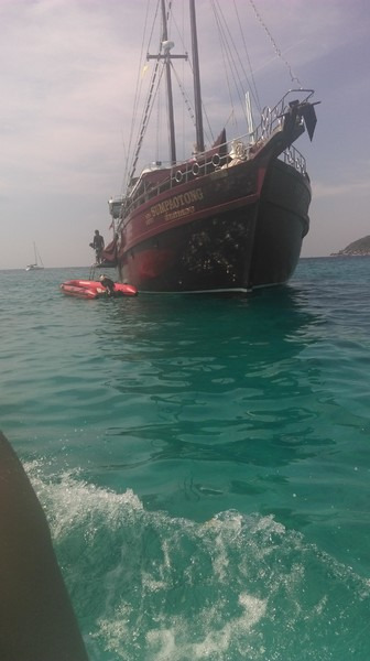 我们30多个人坐两艘皮划挺依次上船,船上的工作人员都是海盗打扮哦。这里的中文导游叫阿伟,他会分发一些冰水和西瓜菠萝。讲解各种注意事项。一会儿会把船停在有海龟出没的地方,开始重头戏-----浮潜。这时候大家都处于兴奋状态,等不及想看斯米兰的水下世界。