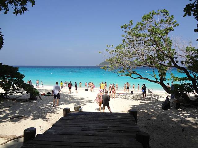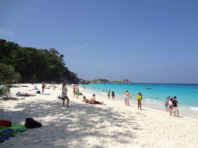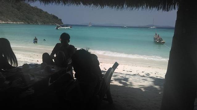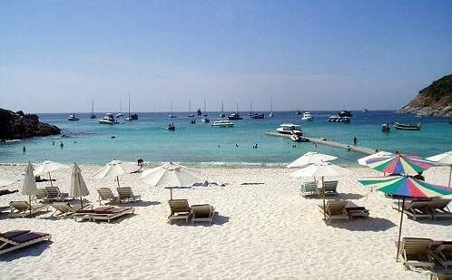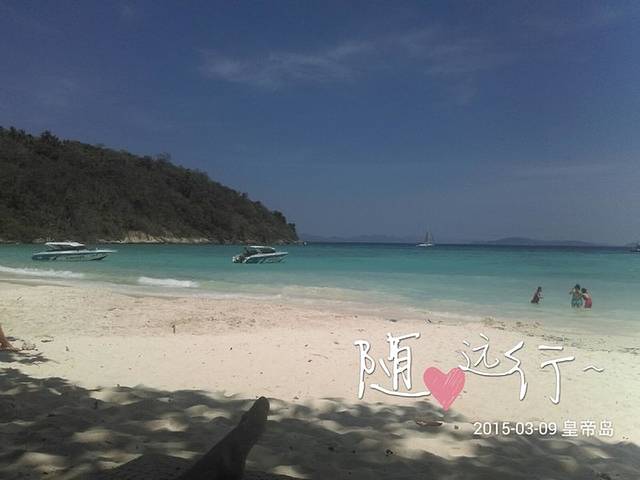 皇帝岛很近从码头乘快艇半个小时就到了,海水清澈沙滩细白,只是有些落叶和碎石。选择这个沙滩的大概有四五搜快艇的游客,人不算多了。上岸记得先去找中意的躺椅把随身东西放好,这个是要单独收费的,好一点的200铢普通的100铢/天,付完钱就可以下海畅游了。