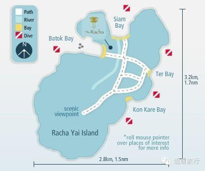 皇帝岛最大的海滩叫Batok Bay,这个沙滩的海岸线是四个里面最长的,这里有五星级的The Racha Hotel皇帝岛拉查酒店,酒店前面就是Batok Bay;另一个海滩叫Siam Bay,是岛上的第二大沙滩,沙子和水都很不错,而且人少,显得悠闲,这里有一个Rayaburi Resort Racha Island Phuket普吉岛瑞阿布瑞度假村,是一个四星级的酒店;还有一个沙滩叫Ter Bay,在码头附近,这里有些停泊的船只,拍照风景很美。下海的时候,海里都是细软的沙子,不会被暗礁划伤手脚,游到深一点的地方会看到许多海星,水很蓝,可以浮潜;最后一个海滩就在Ter Bay旁边,叫Kon Kare Bay。这个海滩很适合浮潜,这里的小鱼一点不怕人,它们会围着你转, 不过要小心一些暗礁 。
