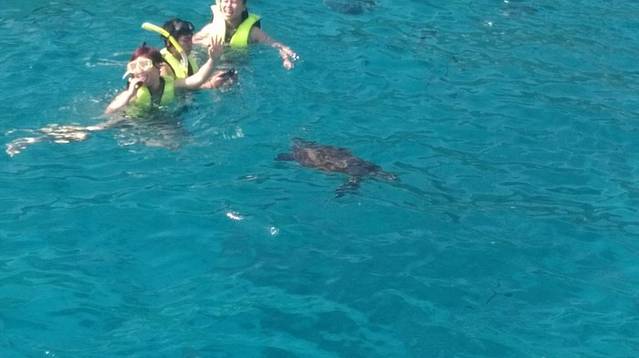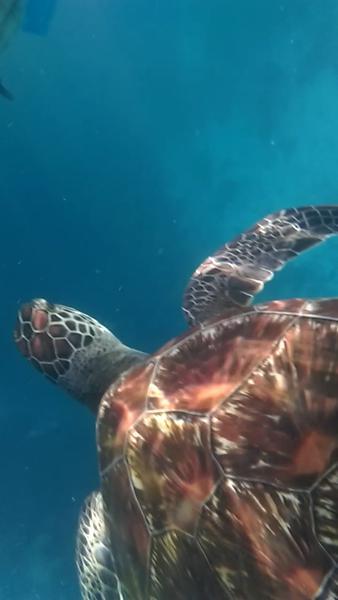 迫不及待地下了水,哇,果然是一年中只开放半年才保护出来的优质海域,海水非常清澈,可以清楚的看到海底,有个各种品种五颜六色的鱼,并且体积都很大。如果水性不好的人,可以跟着导游他会拿着一条绳子牵着一个救生圈把大家带到远一点的地方。因为已经很熟悉浮潜道具了,我就自己在旁边游,时不时的就会听大家喊海龟又来了,就赶紧往那边游。我买的防水袋质量很不错完全不漏水,但是下水了才发现因为水压触屏完全不好使了,侧键又很难按,没有办法拍照。这个时候海龟居然游到了我身边,我急的不行,还好发现不小心把拍照改成了录像,哇哈哈还可以录像的嘛,就这样我拍到了海龟与我同游的画面,而且很清楚哦。传不上来截个图吧。