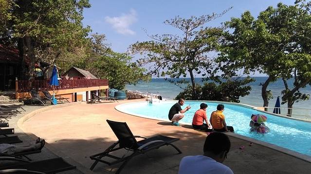 快艇开了十几分钟,停在了一个山崖附近直接跳到海里浮潜。导游会发救生衣和呼吸管,要记得选择很贴身的救生衣。其实最好先在泳池里练习一下。像我直接跳到海里还是很惊慌。开始掌握不好呼吸管的用法。难免会进水,在海中央水很深但非常的清澈,可以直接看到海底。可惜鱼不是很多。还好穿着救生衣又会一点游泳慢慢的掌握了方法,飘的有点远的时候,船上的小黑就会游过来把你拉回去,很安心的。因为早上没有吃多少东西到了中午就饿的前胸贴后背了,不知道为什么浮潜看似轻松却很消耗体力。前后大概一个小时就回去了,回到沙滩休整一下就开饭了。