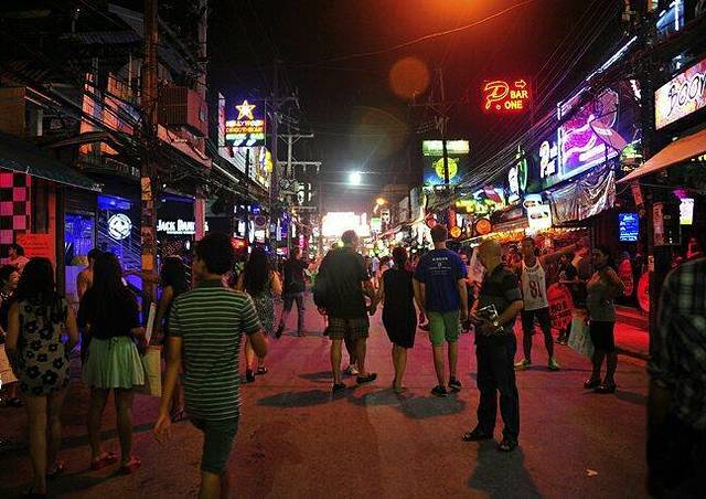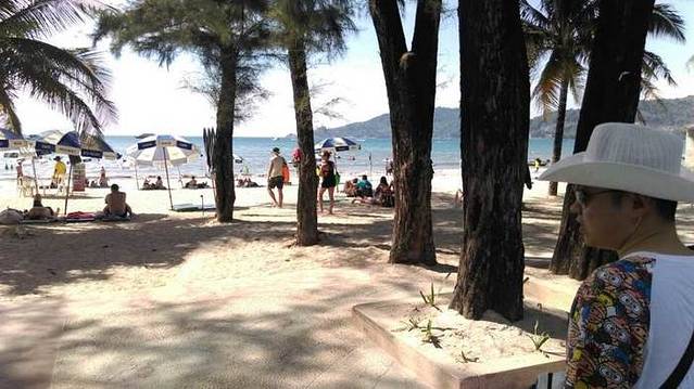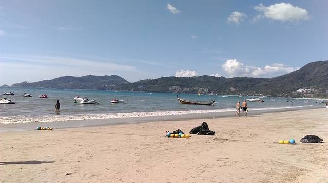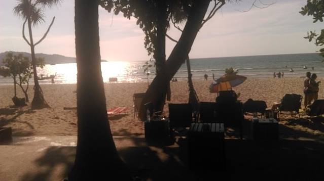 入眼的芭东海滩是层层渐变的蓝色海水,很多在玩拖拽伞和水上摩托的游客。因为人多,水质确实很差。随便找了一家海边的酒吧,点了两杯凉茶。看风景吹海风。一直到晚上6点多太阳还挂在半空中没有要落山的意思,感觉赚到了很多时间
