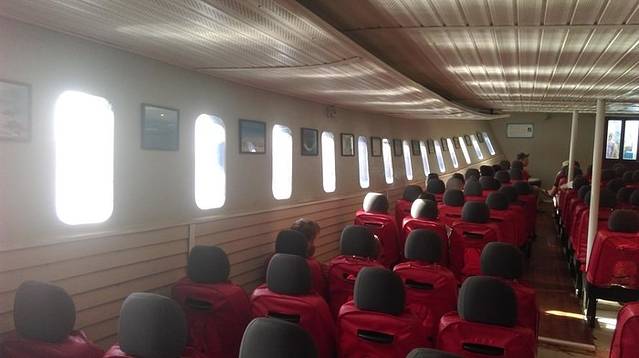 大船一共分三层,地下一层客舱很昏暗空气也不新鲜,登船的这一层一半是头等舱另一半的普通客舱座位很少,是最舒服的位置了,但是上船晚一点就别想了。上一层也是vip,船头和船位是露天的,超晒的不过早上的海风吹着不热,几乎都是外国人。没办法只能在地下客舱了,还好人不多可以躺下睡觉,船上提供小面包和咖啡冰水可以凑活吃点。