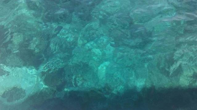 船上的救生衣和浮潜面罩挺多的可以选择合适自己的,还有近视的面罩哦,大概十几分钟就到蚊子岛了,这里是不用登岛的,直接把船停在岛附近,我们本来想自己下去浮潜的,没想到船长和船员也下来了,正好一个人带两个,我们就扶着船长的肩膀都不用自己游。他穿着脚蹼带着我们慢慢向山崖方向游,这里的水很清澈慢慢的由浅到深,水下的珊瑚很多带着紫色的荧光斑点非常漂亮,水里虽然没有大量的鱼群,但是可以看到不同品种各种颜色的鱼,途中有很多的海胆,船长总是不厌其烦的指示不要碰,还不时的下去给我们捞超大的野生海参和蓝色的五指海星面包海星给我们看,然后再放回去。
