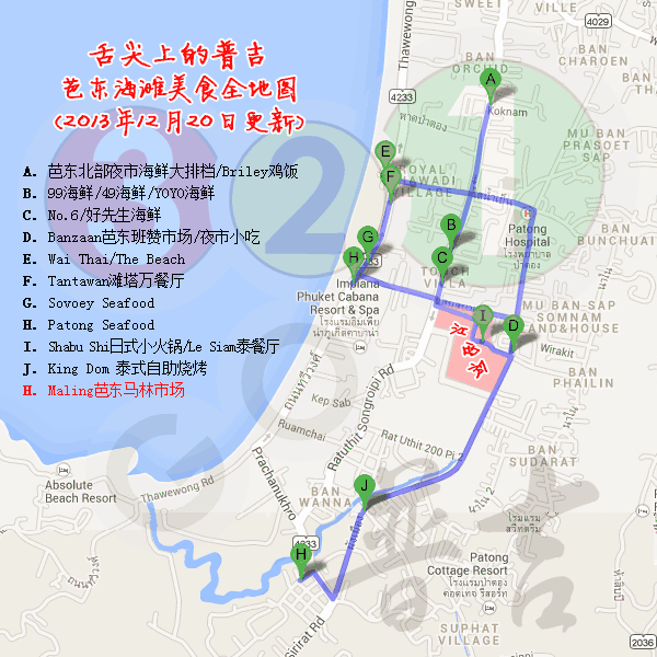 晚饭时间,按照美食地图去了A区域的北部海鲜大排档。不像酒吧街那边的大排档那么多人,不过走过去确实是有点远的,价格都比较统一也就抹个零,还好我和姜先生都能接受泰国菜的味道。ps我住的酒店就在J和D之间水渠的尽头处(rad uthit 200 pi)。