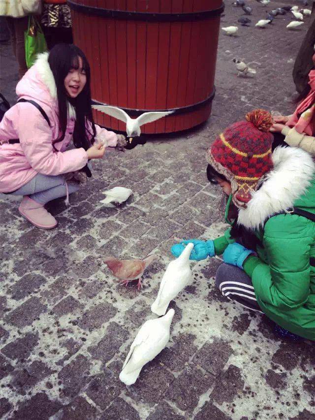在教堂外面的广场,喂鸽子是一件其乐无穷的事情,我们两个和这些和平使者亲昵了很久,它们不惧怕我们,一旦你摊开掌心,它们便蜂拥而来。