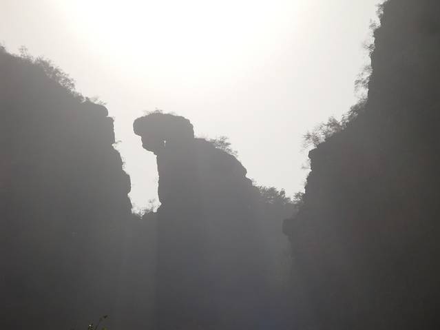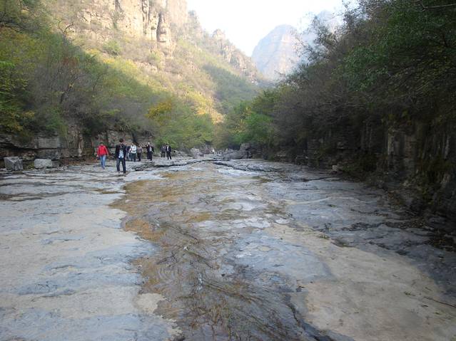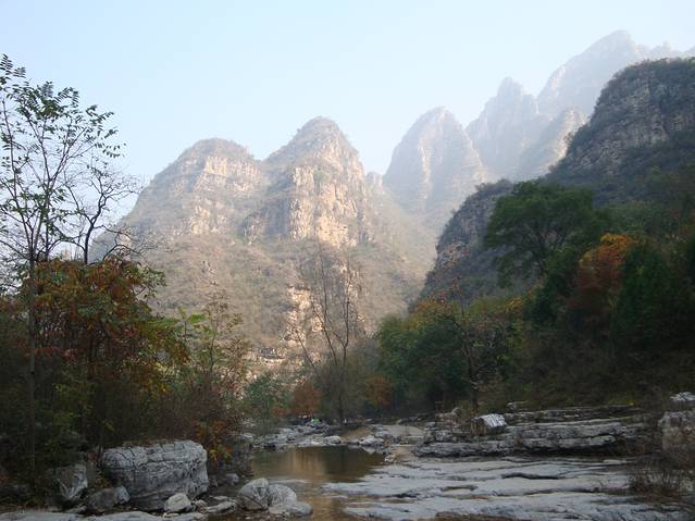十渡孤山寨景区离北京城区有点远,坐公交车大概需要2个多小时。孤山寨位于十渡里的六渡,它傍依拒马河,景色优美,很有南方张家界山水的秀丽景致,这在北方是不多见的。秋天的孤山寨景色迷人,在蓝天白云映衬,湖光山色很是秀美,景区里还可观赏红叶,非常漂亮。我们先去了十渡拒马乐园,然后下午来了孤山寨,买的是60元的门票,门票包括景区和铁索桥。里面有很多游玩项目,但个人感觉最值得称道的还是这里的山水风景。有两条游玩路线:野人谷和一线天,推荐先去一线天(这条线景点很多),下来再去野人谷,因为野人谷瀑布群可以沿水走进去很远,而且景色变化不大,没有必要走那么远,如果先去一线天,这样两条线都可以游玩。所需时间3小时左右。我们是先去的一线天