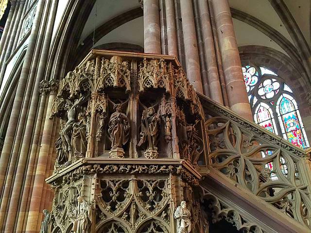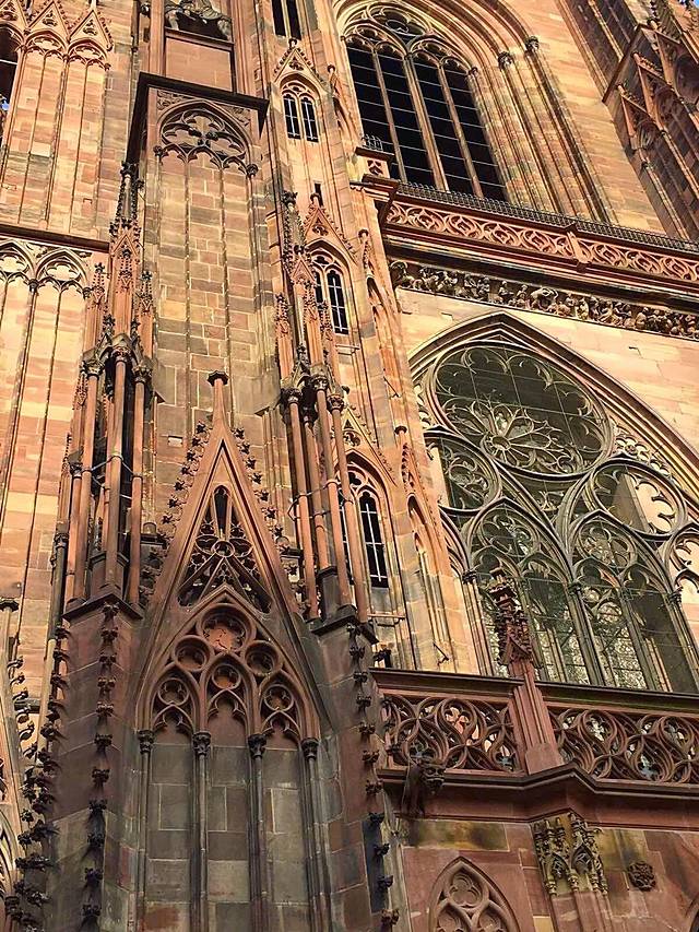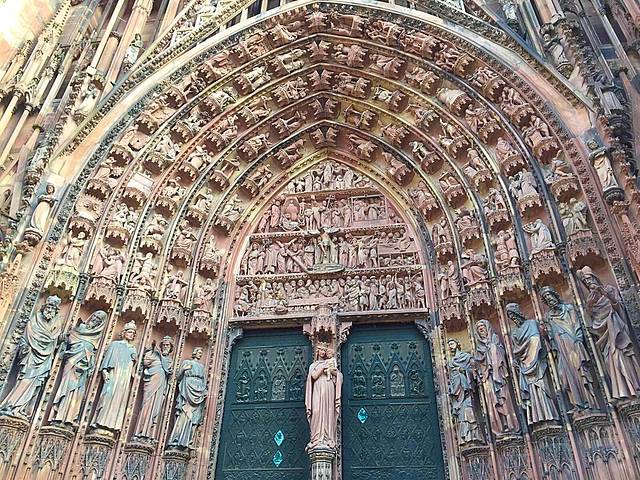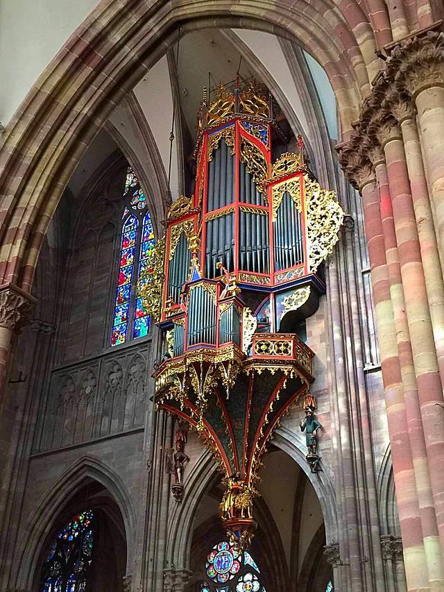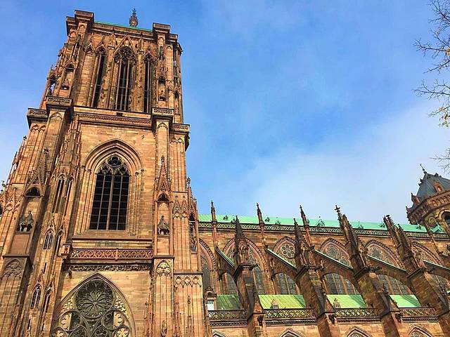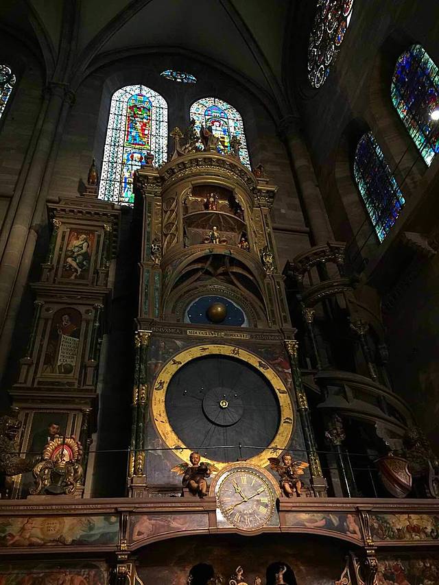 斯特拉斯堡大教堂始建于1176年,直到1439年才全部竣工,用孚日山的粉红色砂岩石料筑成。正面顶上,一边是一座高142米的尖塔,另一边却只有一座平台,此处原应该是一座对称的尖塔,由于当时的财力有限而没有建起来,如今反倒成了它的特色,斯特拉斯堡大教堂也因此而极负盛名。教堂内有一个11米高的天文钟(L'Horloge astronomique; Astronomical Clock),建于1838年,每隔15分钟有儿童、青年、壮年及老年代表人生4个阶段的机械人出现,但每一整点有死神提着板斧出来报时,至今准确无误,到中午12点30分鸣钟报时之际,就会有众多的人物轮流出场,带来引人注目、生动活泼、风趣幽默的场面。