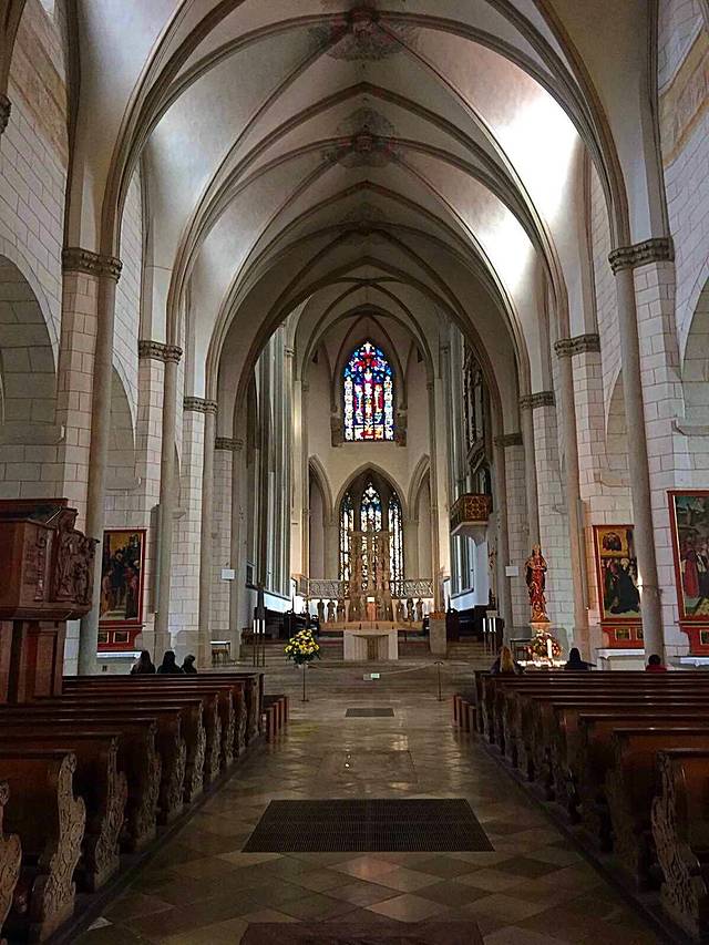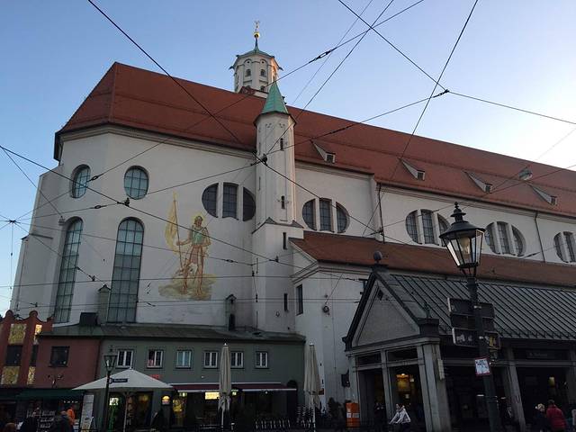 圣母主教座堂 Hohe Domkirche Unserer Lieben Frau zu Augsburg,这座大教堂最初建于11世纪。铜门于14世纪所加,描绘了《旧约全书》的场景。教堂里珍藏了罗马式圣母画像(唱诗区下的地下室)、荷尔拜因(Hans Holbein)的壁画、最早可追溯到12世纪的壁画(如《先知之眼》),以及德国最古老的彩绘玻璃窗。