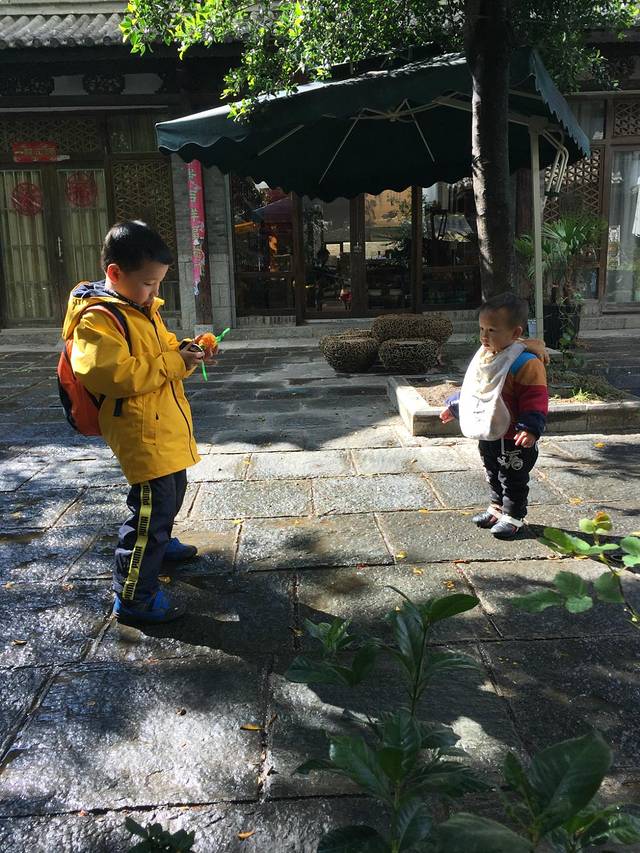 因为还是有点雨,我决定当天就在古城里随便晃悠下。在客栈用完早餐大约10点多钟,从我们住的地方走去古城北门大约15分钟,即使是这样的淡季,古城里的人流量还是比我预想的要多。毫无目的地在复兴路上晃着,我看看建筑看看小摊也是很自得其乐的,但某娃没得玩有点不爽,后来给他买了一个25元的陀螺搞定。