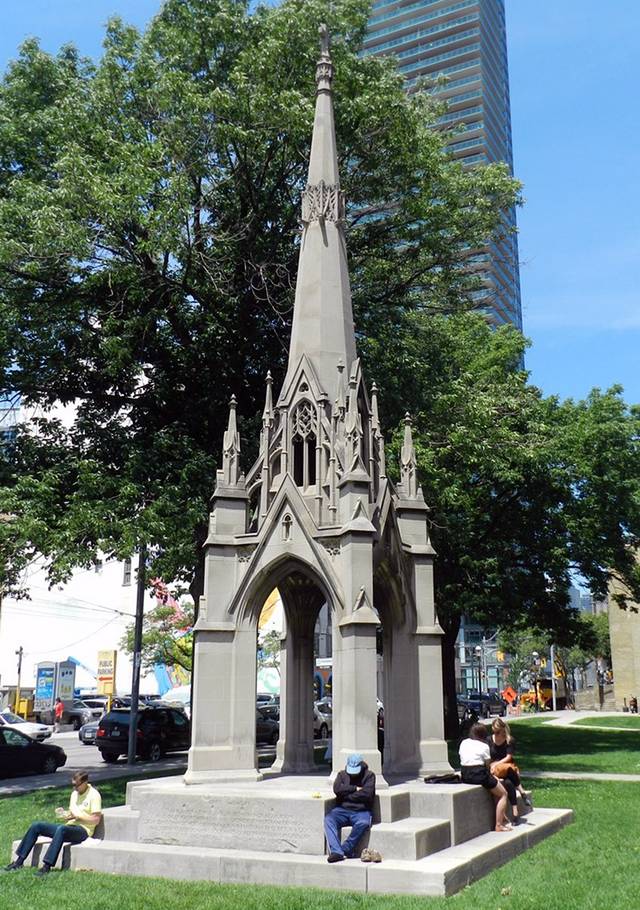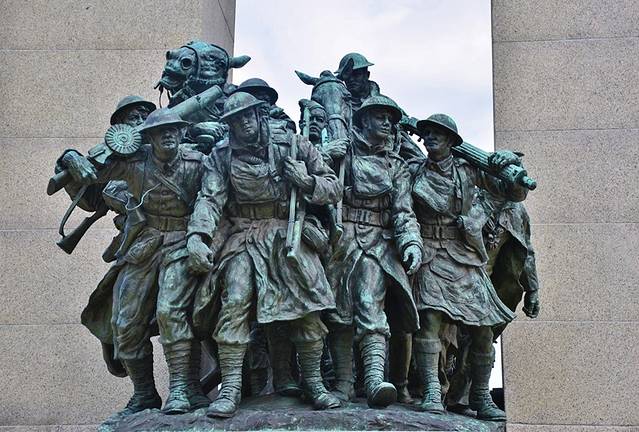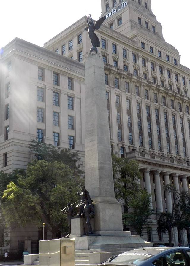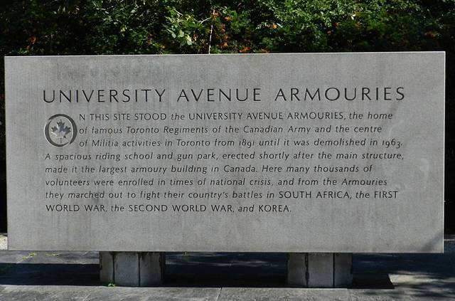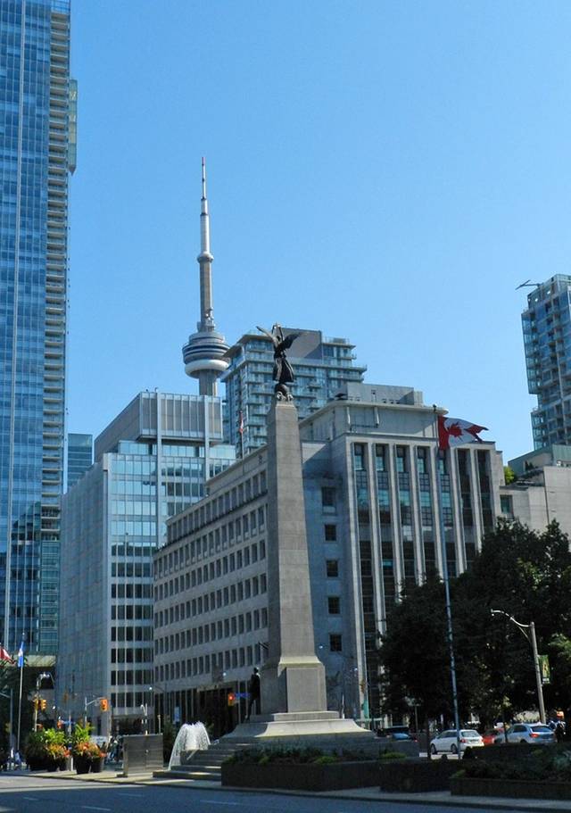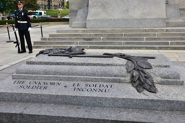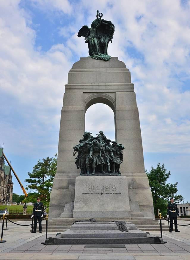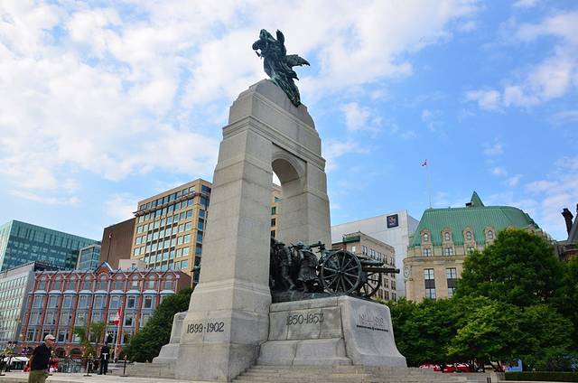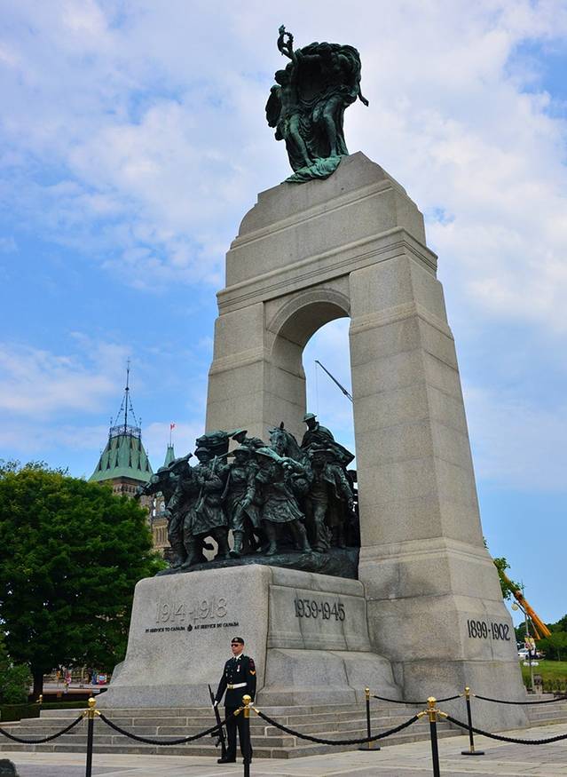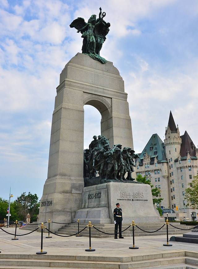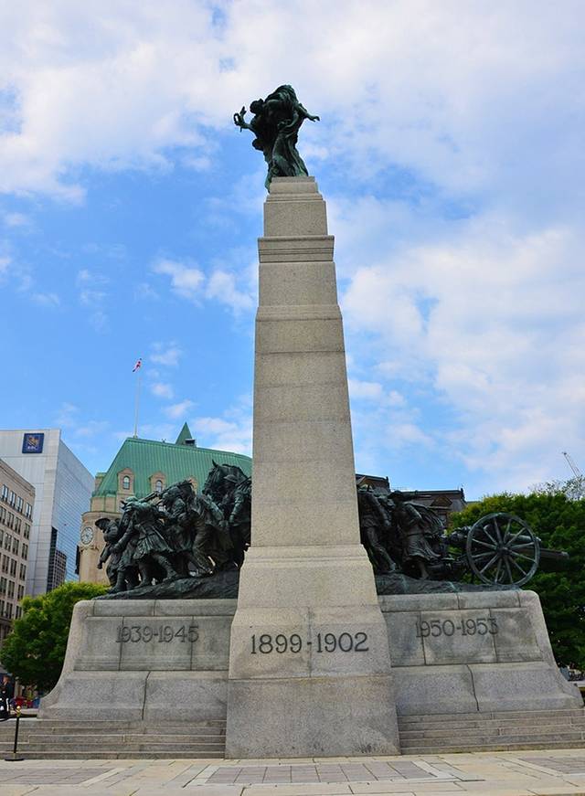 过了邮局所在的街角就是战争纪念碑了。这座纪念碑建成于1939年,起初是为纪念第一次世界大战时期阵亡的加拿大烈士而建的,后来逐渐演变成加拿大人对所有在战争中阵亡的加拿大烈士的纪念地。其中不仅包括一战、二战和朝鲜战争,还包括1899-1902年加拿大参加的南非布尔战争,甚至都能近到2014年,等等各次战争中为国捐躯的烈士。纪念碑的各个侧面分别镌刻了战争的发生的时间,下面我们转着圈看一下。