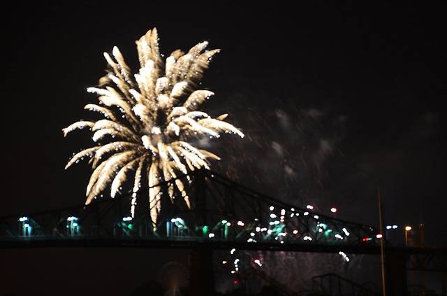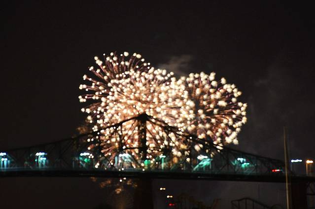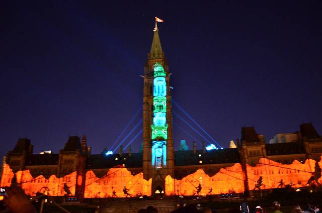 表演不等人呀(而且我们就在渥太华住这一个晚上)。我飞快地盘算一下,就算跑着来回,拿来三脚架也只能拍个尾巴了,干脆硬挺着吧。于是下面这些照片,一大半都是惨不忍睹的了,仅供大家看个意思。你们自己去国会山看灯光秀,千万要带三脚架,带三脚架,带三脚架!重要的事情要说三遍。