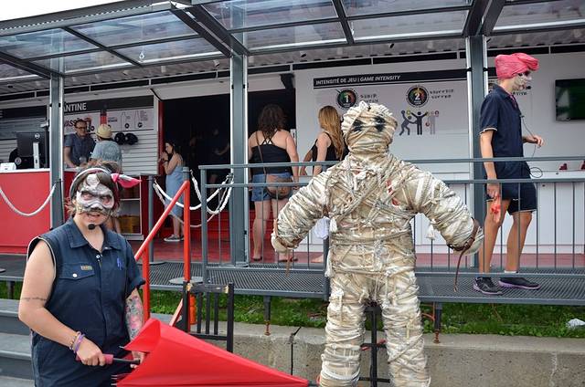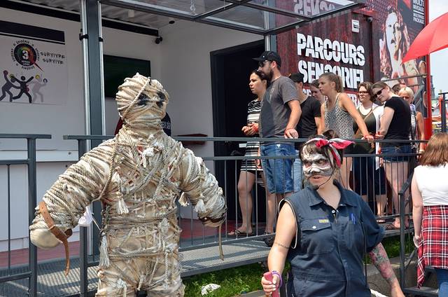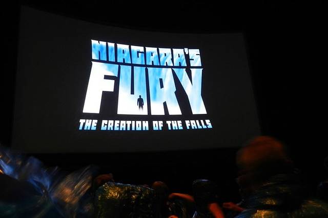 在游客中心里,我们先在快餐店吃了简单的午餐,然后上二楼排队参加Adventure Pass提供的活动“尼亚加拉的震怒Niagara's Fury”。排队过程中每名游客都得到了免费发放的蓝色一次性雨衣,然后进入放映厅。首先放映的是一段动漫影片,讲一个小男孩要写一篇作文,正在冥思苦想之际一本魔法书来到他面前,并带他进入时光穿梭,回到了地球创世纪之初,尼亚加拉大瀑布形成之际。