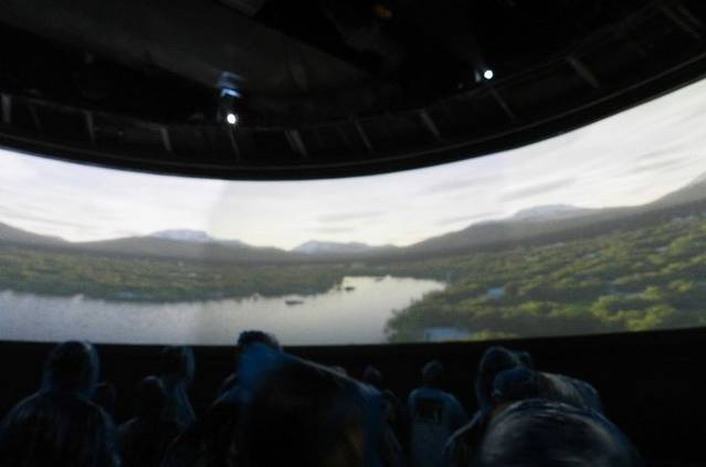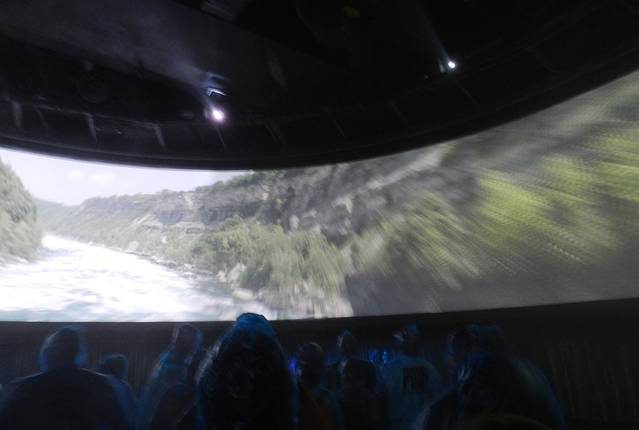 然后开始播放航拍的尼亚加拉大瀑布风景,环幕电影的画面带着你飞越高山峡谷,在大瀑布附近来回穿梭,配合影片的播放,地板不时倾斜振动,用音响模拟雷声和雨声,还有各个方向的喷水口不时向观众喷射水柱,模拟被瀑布淋湿的情形。不过女儿对此实在很不感冒,说这比真的大瀑布水小多了,没劲。