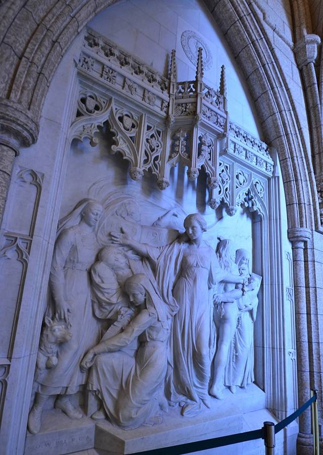 这是建筑群正面中央耸立的高88.7米高的和平之塔Peace Tower,它是国会大厦中最高的建筑物,更被誉为世界上最精致的哥特式建筑之一。它是为了纪念第一次世界大战时为国捐躯的66650位战士而兴建的。和平之塔内有一座由4.88米的四面钟以及53个铃铛组成的定期演奏的钟琴,每日下午1时整便会准时敲响。