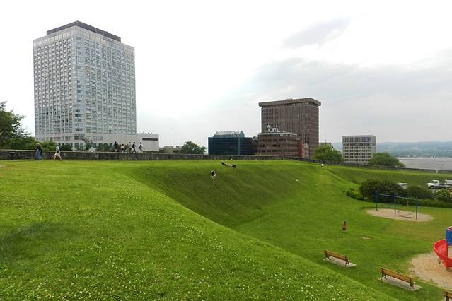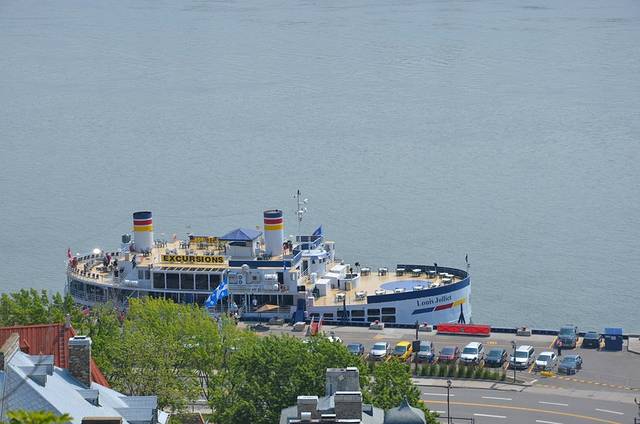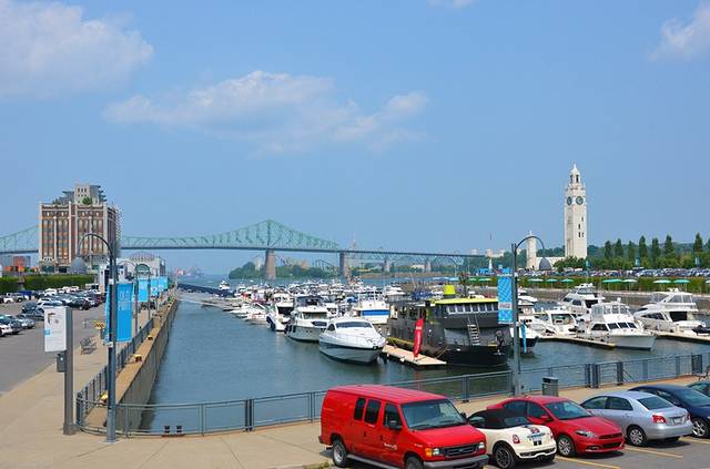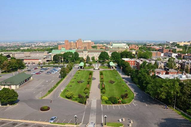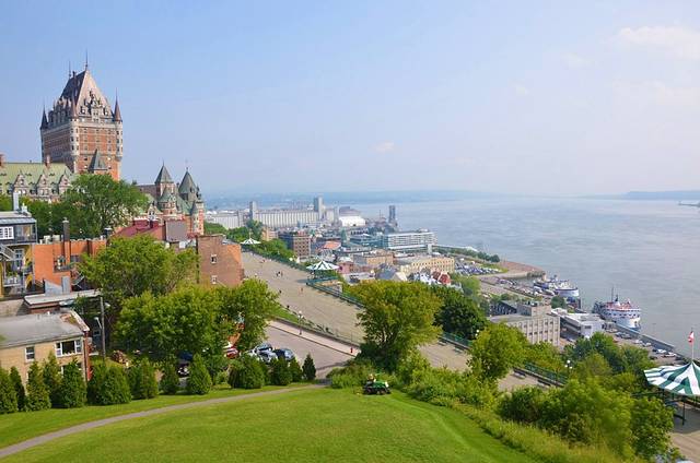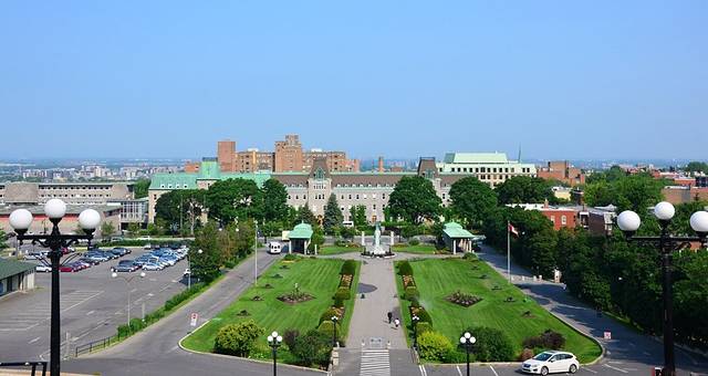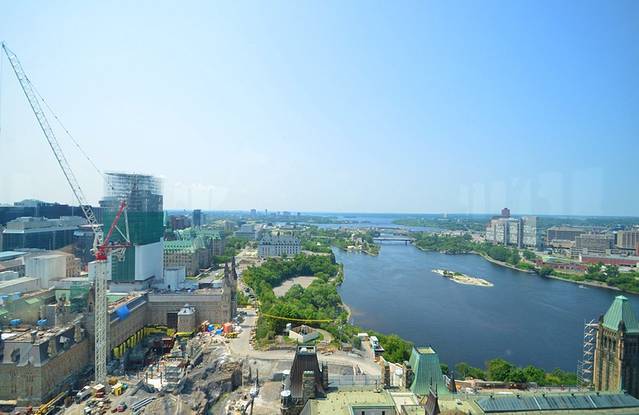视线向东北,Alexandra桥的全景,渥太华这侧的桥头便是国会大厦建筑群,比较显眼还是维多利亚女王图书馆和最高的和平塔,正在维修施工的是国会大厦西翼建筑。
