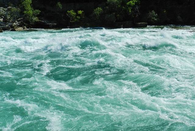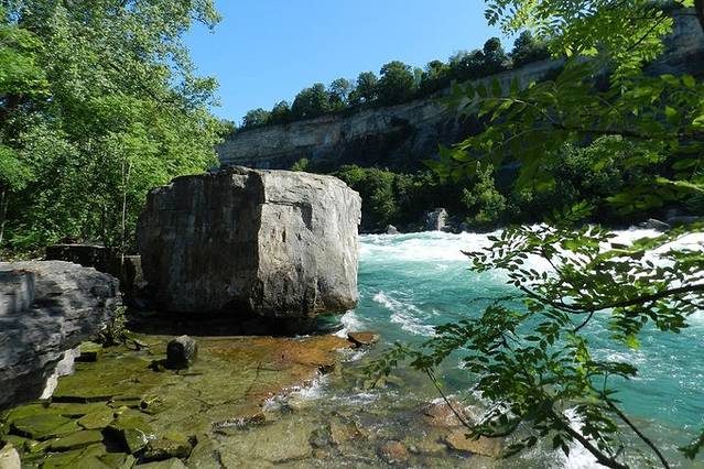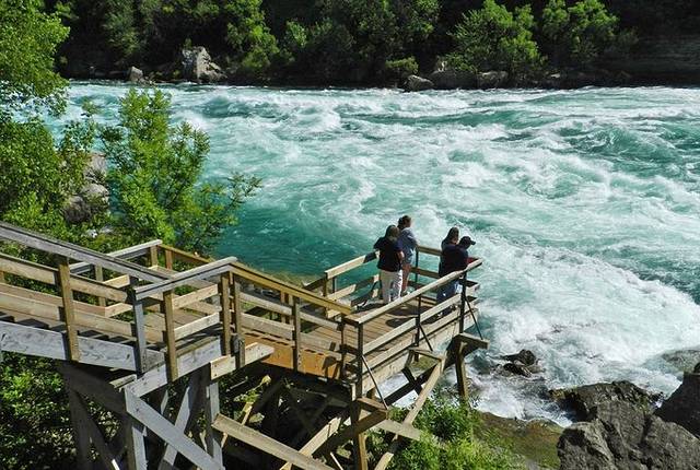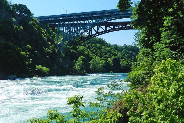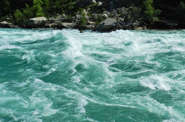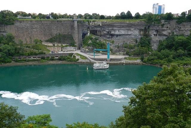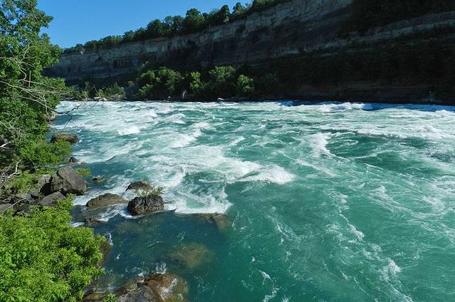 尼亚加拉大瀑布的水流冲下悬崖后重新汇合,在峡谷里继续翻滚腾跃,在不足两公里长的河段上以高于大瀑布的流速(每小时35.4公里)跌荡而下15.8米的落差,演绎出世界上最狂野、最恐怖、最危险的漩涡急流(刚才的白浪漫步路便是其中的一段);接着又冲进深38米的漩涡潭,然后一个蛟龙翻身,经过左岸加拿大的昆斯顿、右岸美国的利维斯顿,冲过“魔鬼洞急流”,最后由西向东注入安大略湖。